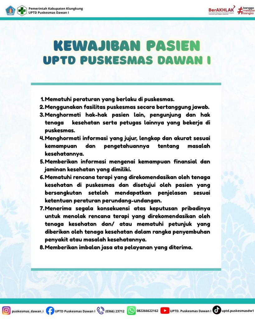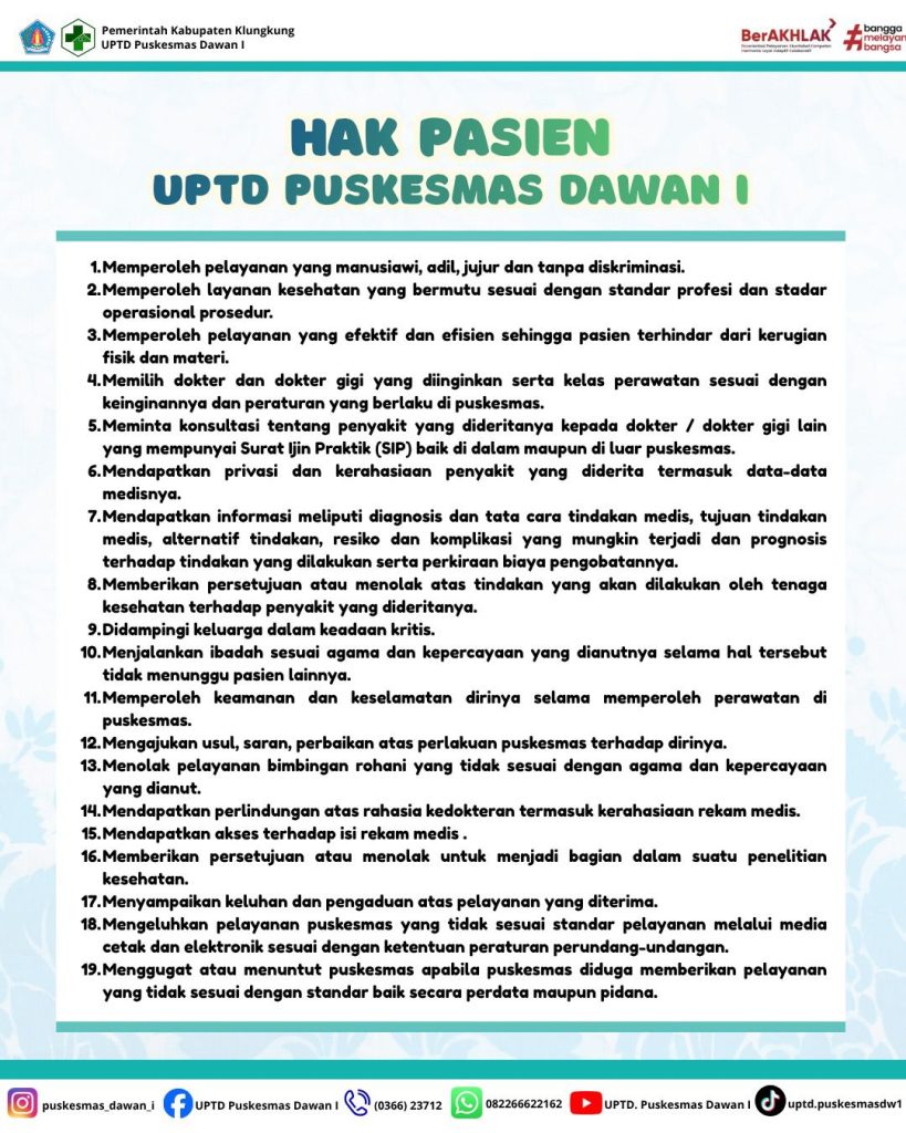 Berikut kami sampaikan Hak dan Kewajiban Pasien di UPTD Puskesmas Dawan I kepada masyarakat selaku pengguna layanan kami di UPTD Puskesmas Dawan I.
