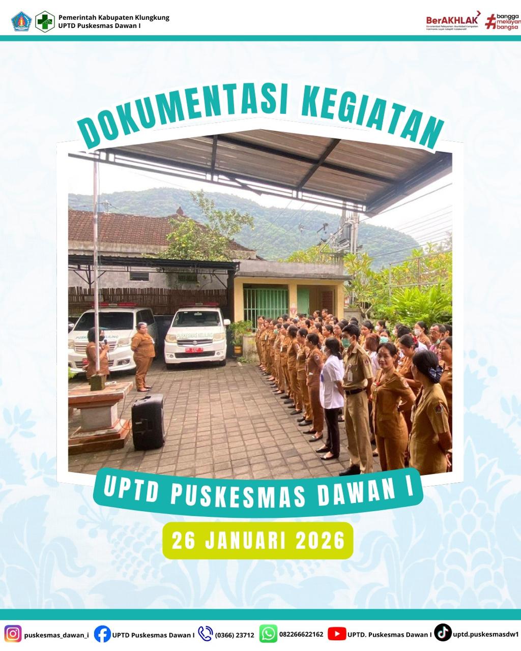 1. Apel pagi staf UPTD Puskesmas Dawan I, apel ini merupakan kegiatan rutin yang dilaksanakan setiap hari Senin – Kamis pada pagi hari menjelang pelayanan dan siang hari setelah selesai pelayanan puskesmas.